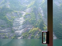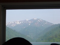 奥只見湖から見える燧ヶ岳 湖畔の山肌に見られる雪崩道