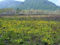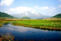 竜宮十字路から至仏山を見る。 低層湿原に見られる池塘の中の浮島